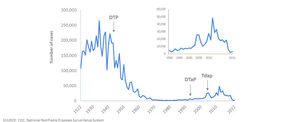 Reported pertussis cases in the United States, 1922-2022