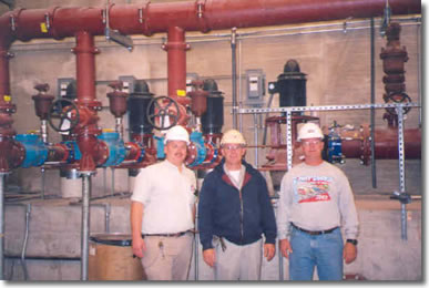 | From left to right, Marc Wolff of the Bureau of Prisons, Kent Faulkner of Sandstone, and Doug Kissick of L. S. Black Constructors, the general contractor, in front of the high service pumps.. |