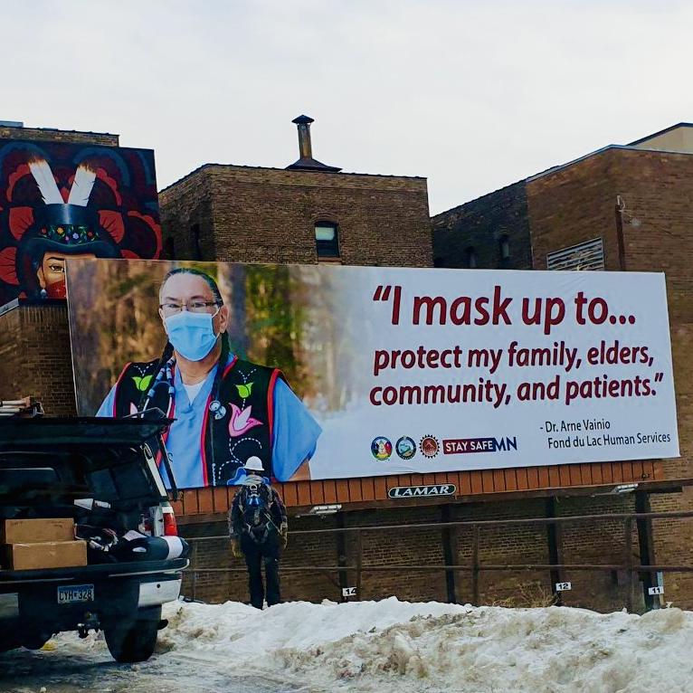 American Indian Community Housing Organization (AICHO) worked with local public health on a billboard in Duluth featuring American Indian physician Arne Vainio, MD, and culturally tailored public health messaging.