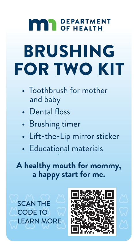 Brushing for Two focuses on the importance of oral health care during pregnancy. Brushing for Two has both virtual and print pregnancy oral health education materials available. Use is encouraged in any setting where pregnant people will be present. Materials are no cost for the public.